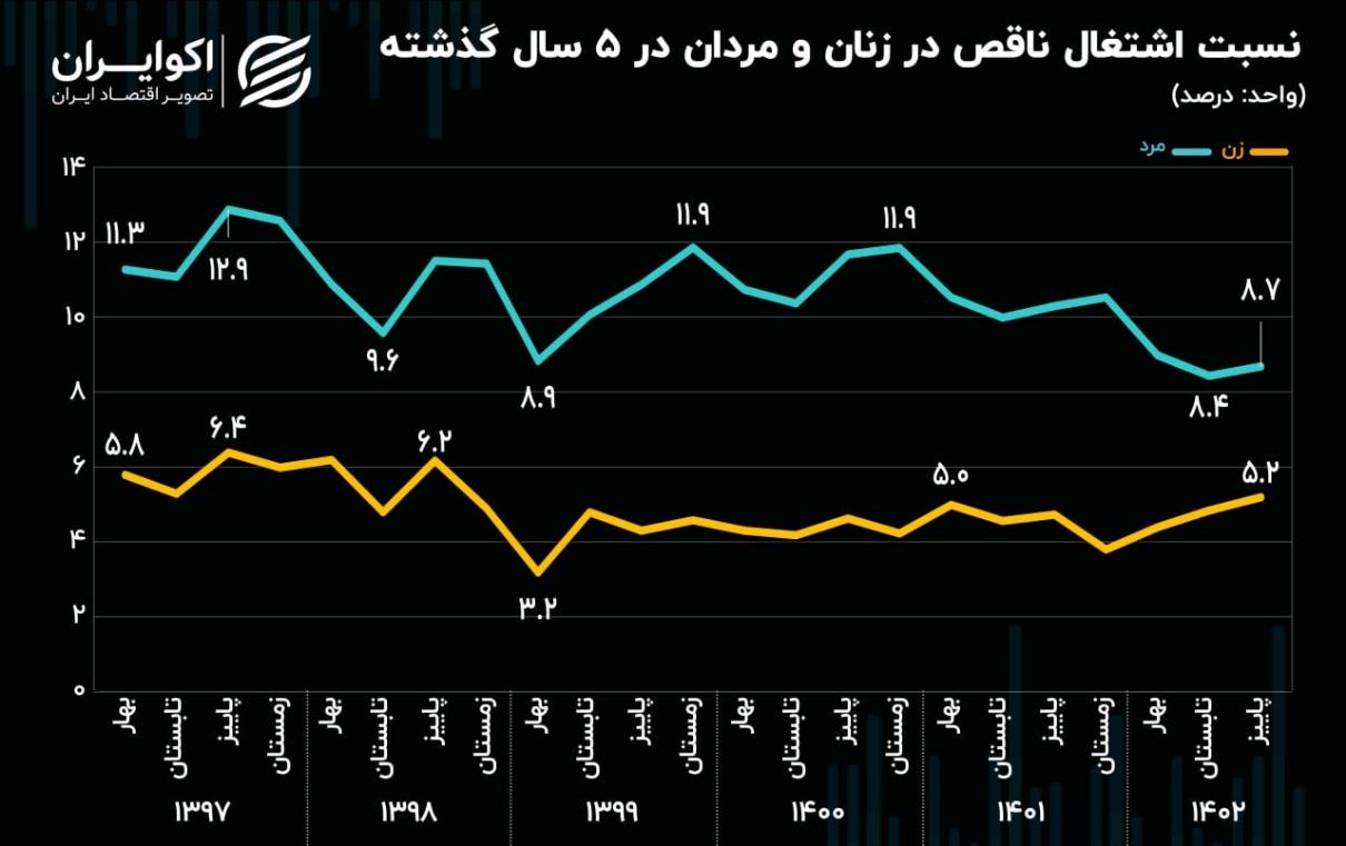 در پاییز 1402، اشتغال مردان، 5 برابر اشتغال زنان بوده است. یعنی از مجموع 24.7 میلیون نفر جمعیت شاغل در سن کار ایران، 20.7 میلیون نفر مرد بودهاند. از این تعداد 1 میلیون و 799 هزار و 861 نفر اشتغال ناقص داشتهاند. بنابراین نسبت مردانی که نتوانستهاند از همهی مهارتها و پتانسیل خود در بازار کار استفاده کنند، در پاییز سال جاری 8.7 درصد گزارش شده است.